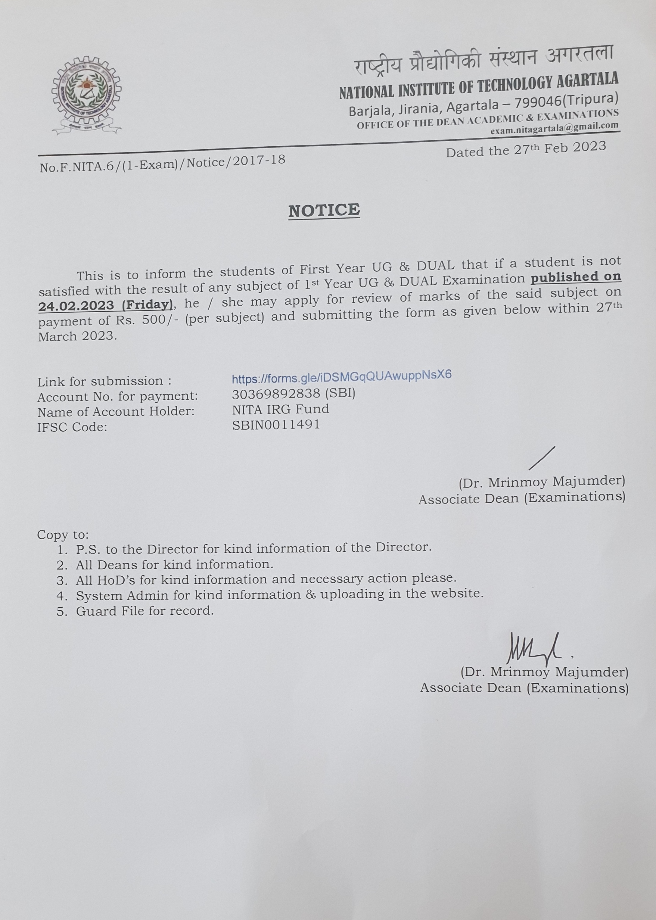 Notice regarding continuation of Ministry scholarship for 02 nos scholars after submission of provisional thesis at NIT Agartala.